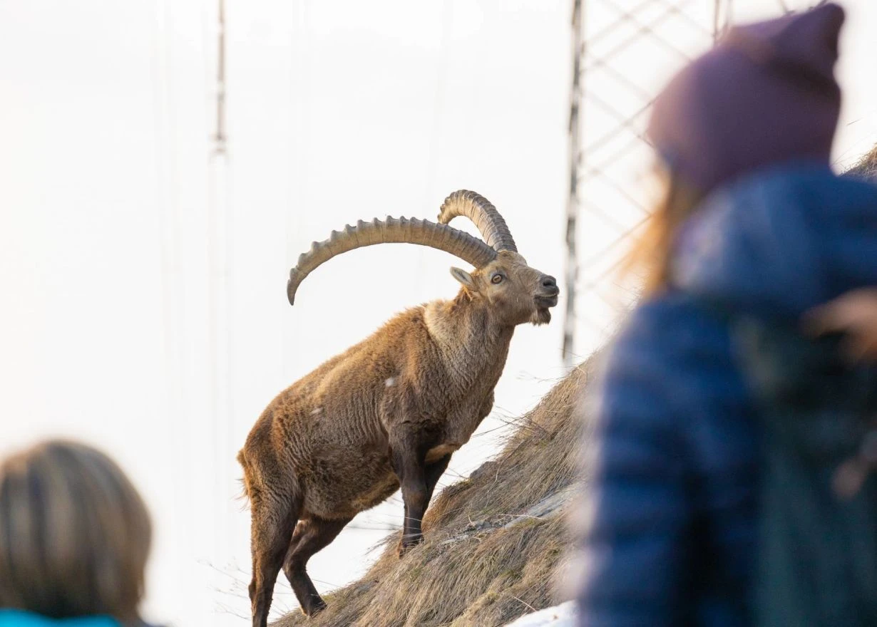 Zusammen wandert die Gruppe vom Gemeinde- und Kongresszentrum zu den Steinböcken, die Route kann variieren, da sich die Steinböcke nicht immer am selben Ort befinden.